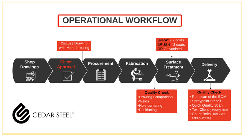 Shop Drawings - Our draftsman engineers create shop drawings based on initial consultations with our clients. The drawings include important information that can be approved by the client/engineers before installation. Client approval - After discussing the drawings with our manufacturing team, we begin fabrication only after receiving approval from the client. Procurement - We source quality steel (mild steel and industrial steel) in Australia for each job, depending on its unique properties. Fabrication - We start fabricating your project based on the approval of the customer and drawings. We check the quality as we go. When we finish fabricating, we do a test assembly to make sure everything is how it should be. Delivery - We provide all types of surface treatments to increase the longevity and durability of your structural steel beam. Our surface treatments include, and is not limited to, Hot dip galvanising, Weather-Proof Primer, and Zinc Phosphate Priming. Surface treatment - Once our quality checks are done, we deliver the product (with the needed Nuts and Bolts) to your site address. We also provide quality installation services for various steel structures.